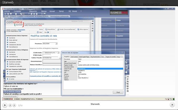 Businesspass presenta inoltre alcuni automatismi che facilitano il lavoro del Professionista come, ad esempio, il collegamento diretto con Comunica (Starweb) che consente la compilazione automatica di tutte le pratiche di Comunicazione Unica utilizzando i dati presenti nell’applicativo o il collegamento con “Clicca&Posta” che rappresenta un ufficio postale virtuale tramite il quale è possibile inviare la corrispondenza.
